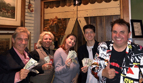 Pictured here with colorfully dressed quizmaster Sandro Monetti and their $75 winnings, Excelsior outpointed rival teams including Four Women and a Baby and Ice Bank Myself.