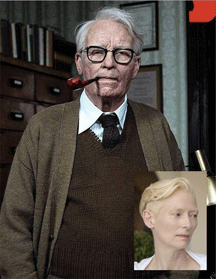 By comparison, Tilda changed from a blonde woman with short hair and youthful skin to an elderly wrinkled man with grey hair – rendering her completely unrecognisable.