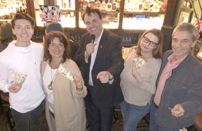 Here’s the winning team pictured with quizmaster Sandro Monetti. From Left to Right: Blaise Serra, Trudy Sargent, Sandro Monetti, Carrie Williams and Frank L’e Sanford.
