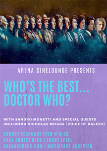 To snap up the remaining tickets for Who’s The Best Doctor Who go to arenascreen.com and select Feb 17.