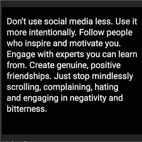 I also spotted this poignant post on a friend’s profile the other day: “Don’t use social media less. Use it more intentionally. Follow people who inspire and motivate you. Engage with experts you can learn from. Create genuine, positive friendships. Just stop mindlessly scrolling, complaining, hating and engaging in negativity and bitterness.“